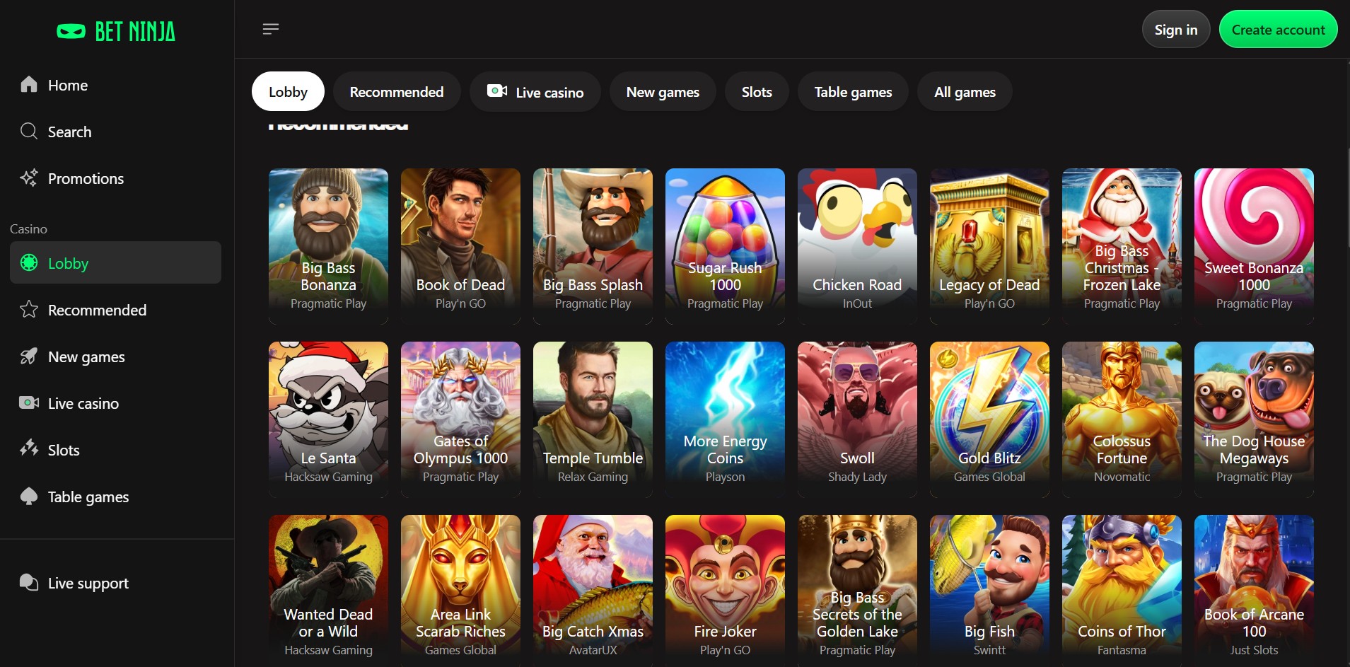 If slots are your primary focus, Betninja delivers in volume and diversity. During our review, we found 2,000+ slot titles, spanning classic fruit machines, modern video slots, and high-volatility feature-heavy releases.